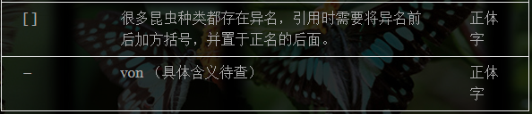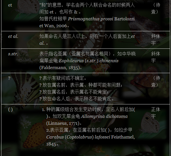 如纺星花金龟 Cetonia fusca Herbst, 1790 后来被移到 Protaetia 属,定名人和年份就应该加括号 Protaetia fusca (Herbst, 1790)。■sp. 、 spp. 、 ssp.