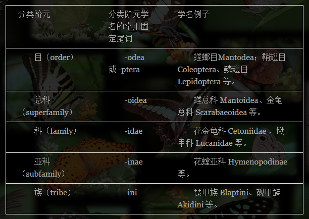 昆虫种的学名是由两个拉丁词组成,第一个是属名,第二个是种名,如独角仙 Allomyrina dichotoma 。