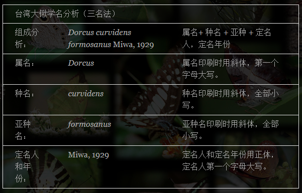 学名(属名、亚属名、种名、亚种名)印刷的时候要使用斜体,以便识别。属名、亚属名开头字母需要大写,种名、亚种名全部小写。
