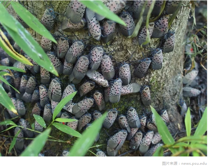 斑衣蜡蝉原产我国,由于受到天敌或病原体的影响,处于受控状态。但当它们入侵至美国宾夕法尼亚州时,由于缺少天敌,得到了暴发式扩展,对当地农林业尤其是葡萄种植业造成严重威胁。