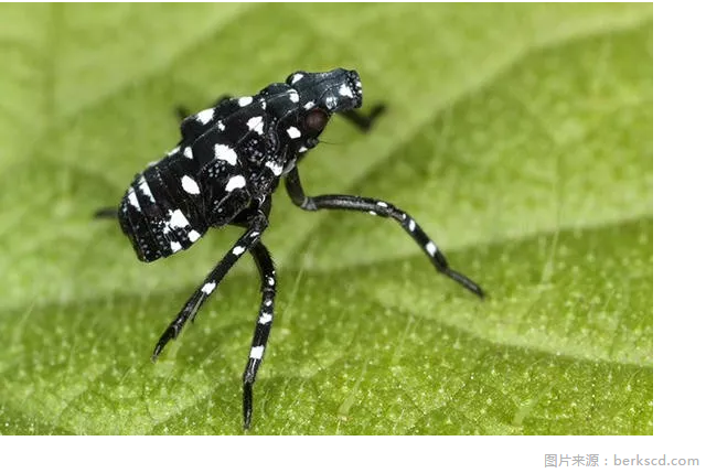 你以为只有成虫如此妖娆,不是的,斑衣蜡蝉若虫期就懂得“波点时尚”。初孵的若虫小小白白的,不多久就会变为黑色,还零星点缀白色的斑点: