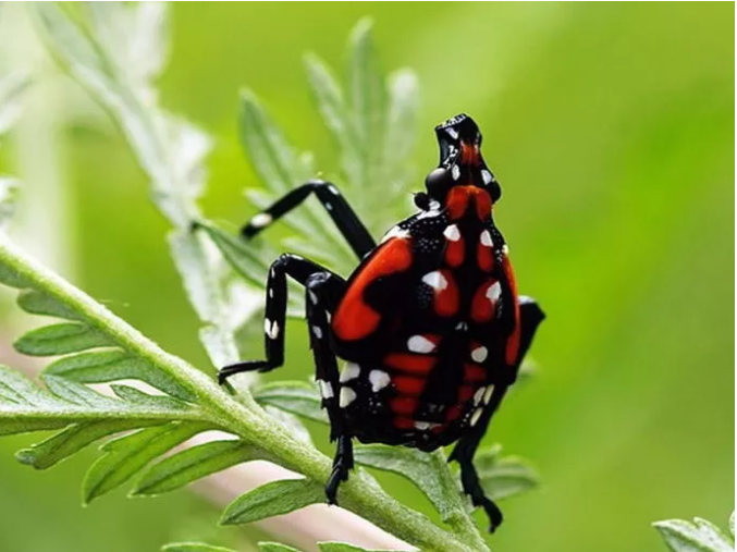 到了四龄若虫期,斑衣蜡蝉会有个华丽丽的变身,褪下黑底白斑的波点服换上红色加黑白点缀的“衣裳”。