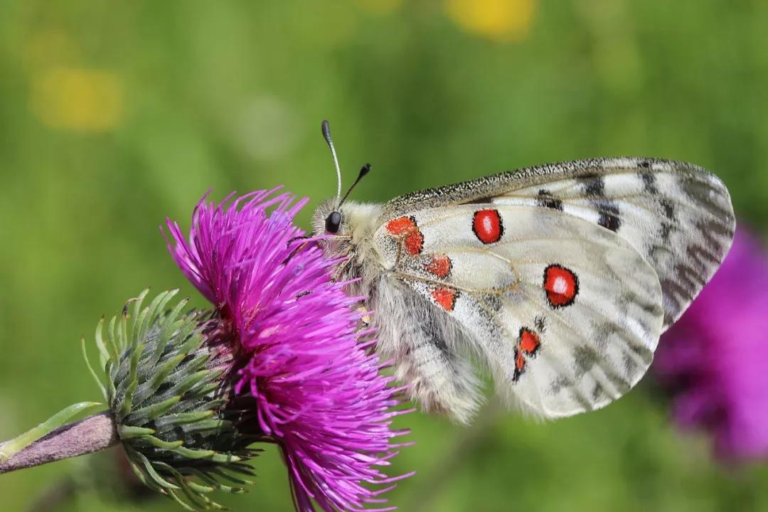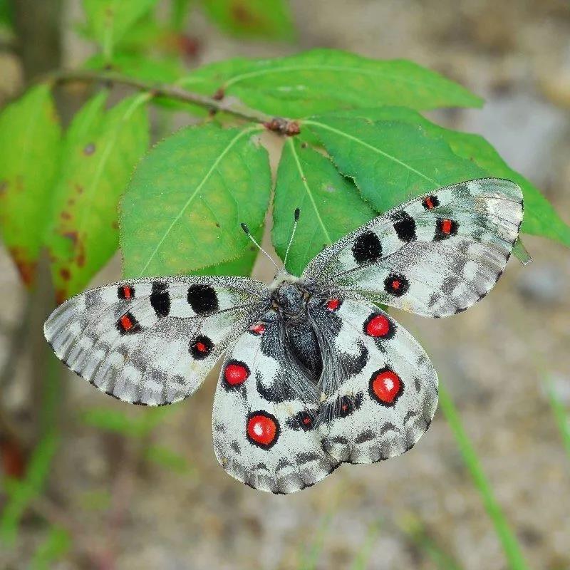 阿波罗绢蝶Parnassius apollo是被列入我国国家Ⅱ级重点保护野生动物的蝴蝶,它们喜欢生活在海拔1000~2000 m的山区,其双翅白色、翅质好似薄的丝织品,翅面上分布红色黑边的大眼斑。