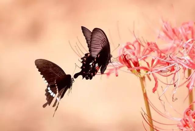 很多种类的凤蝶雌雄形态不同,呈现明显的雌雄二型现象,形态各异的雌雄凤蝶飞舞嬉戏于花丛之中,成为男女姻缘的象征。