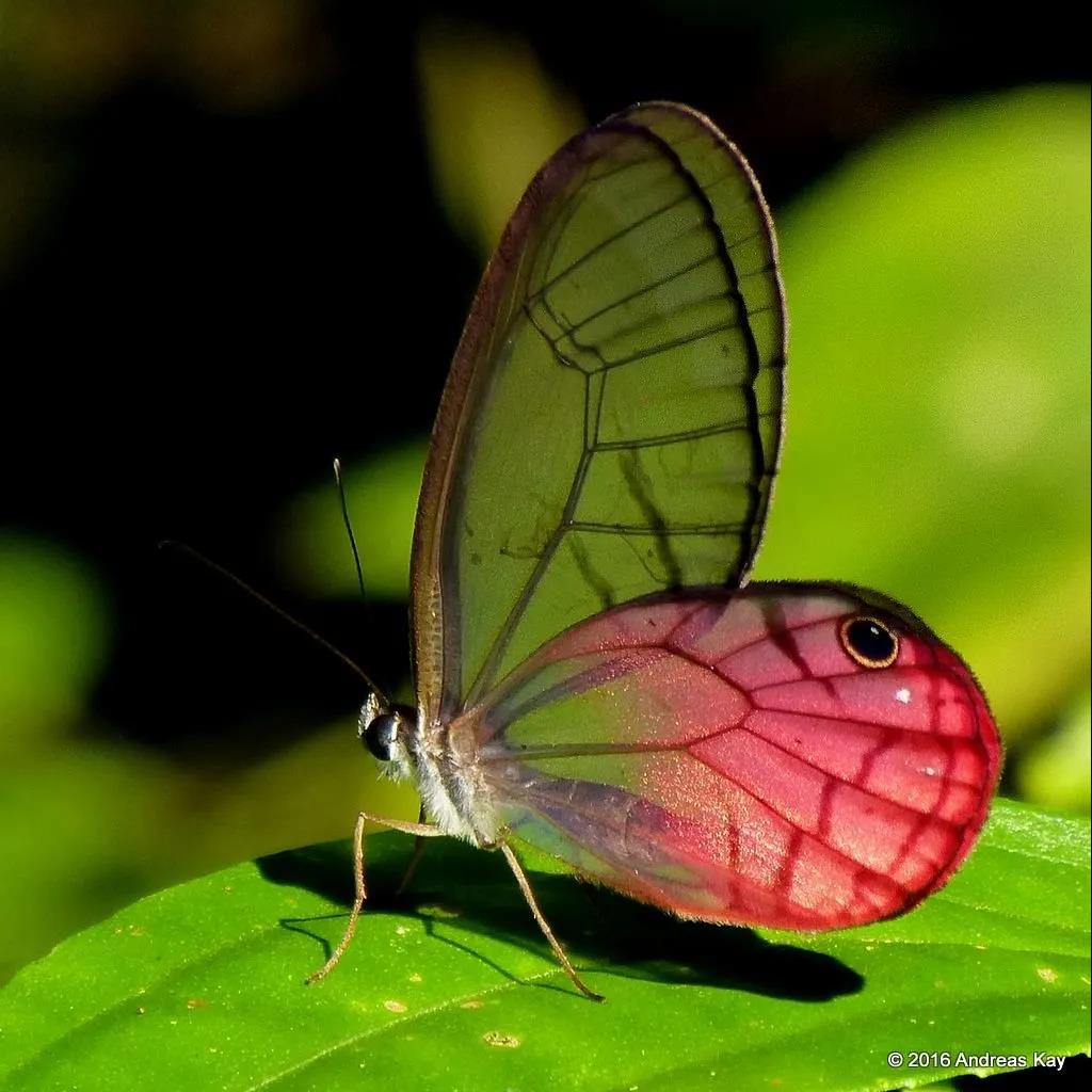 比如著名的玫瑰绡眼蝶Cithaerias aurorina,它全翅透明,薄若蝉翼,而最引人注目的就是其后翅上那一抹妖娆的玫瑰红,透翅还会反射出点点光彩,如水晶般绚丽。