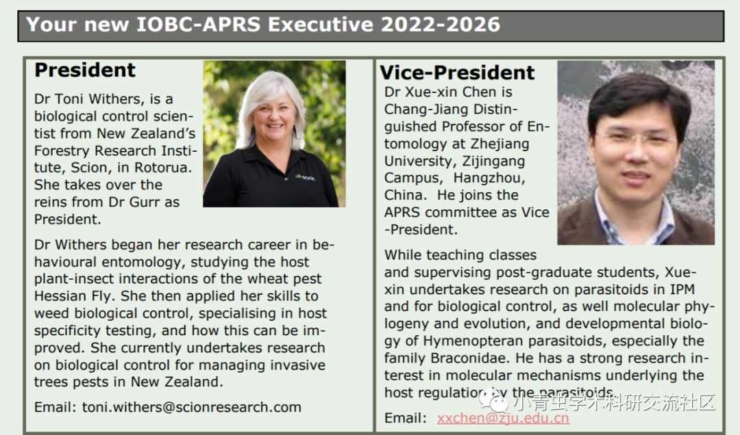 近日,国际生物防治组织亚太区(IOBC-APRS)国际执委会进行改选换届,我国著名害虫生物防治专家、教育部长江学者特聘教授、国家杰出青年基金获得者、 “973计划”首席科学家、浙江大学农业与生物技术学院陈学新教授当选为IOBC-APRS副主席,任期五年(2022-2026)。
