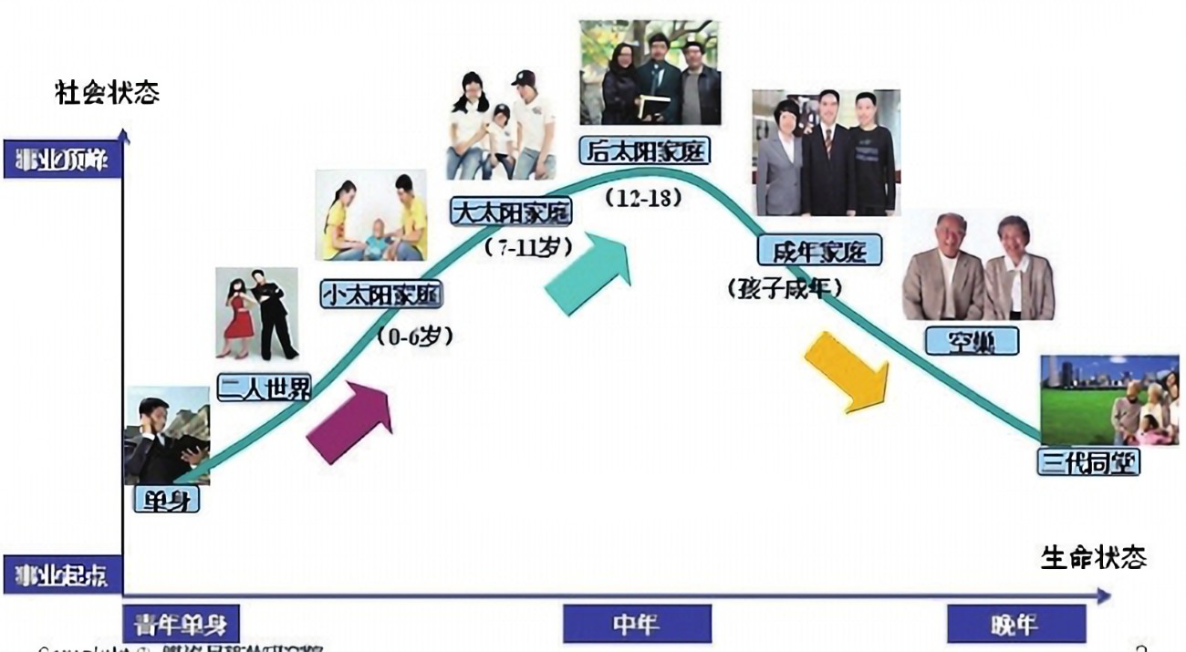 依据家庭主人的婚姻状况、家庭成员的年龄、家庭的规模、成员工作情况,可以把家庭发展过程分为单身期、新婚期、生育期、满巢期、离巢期、空巢期、鳏寡期七个阶段。这七个阶段有机统一,成为家庭生命周期。