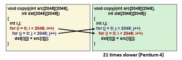 图3是CMU CS213课程的第一讲讲义中的一个例子,说明了求转置矩阵的两种具有同样代码量的不同实现方式,因为其数据访问的局部性的不同,它们的性能在pentium 4上测试的结果相差21倍左右。