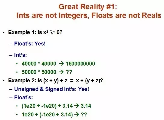 图2是CMU CS213课程]的第一讲讲义中的一张幻灯片,它说明在计算机系统中int型数据不是现实世界中的整数,浮点数也不是现实世界中的实数,例如,对于现实世界中任意一个整数或实数x,都有x*x≥0,但是,在计算机中,某些int型数据并不满足这个结论,例如,当x=50000时,结果会得出x*x≤0的结论。再例如,在现实世界中,整数和实数都满足结合律,但是,在计算机中,某些浮点数运算时就不满足结合律,如当x=1e20,y=-1e20,z=3.14时,(x+y)+z=3.14,而x+(y+z)=0,两者不等。