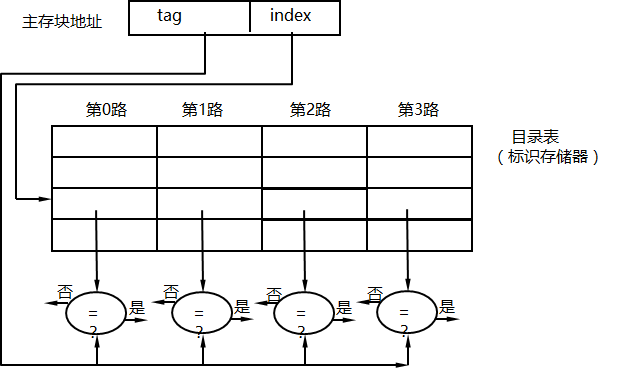 检索过程:Cache将s位的块地址分为两部分:r位作为cache的行地址,s-r位作为标记(tag)与块数据一起保存在该行。当CPU以一个给定的内存地址访问cache时,首先用r位行号找到cache中的此行,然后用地址中的s-r位标记部分与此行的标记在比较器中做比较;若相符即命中,在cache中找到所需要的块;而后用地址中的最低的w位读取所需要的字;若不符, 则未命中,有主存读取所需要的字。
