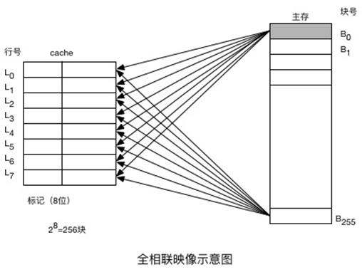在全相联映象中,主存中任一个块能够映象到Cache中任意一个块的位置。将主存中的一个块的地址(块号)与块的内容(字)一起存于cache的行中,其中块地址存于cache行的标记部分中。
