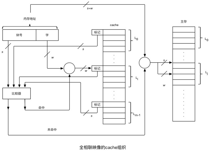 检索过程:CPU访存指令制定了一个内存地址(包括主存和cache),为了快速检索,指令中的块号与cache中所有行的标记同时在比较器中进行比较。如果块号命中,则按字地址从cache中读取一个字;如果块号未命中,则按内存地址从主存中读取这个字。