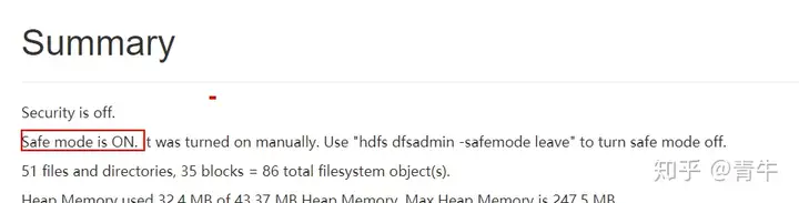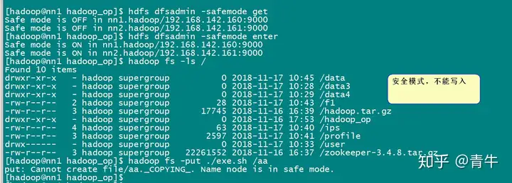 安全模式命令。安全模式是NameNode的一种状态,在这种状态下,NameNode不接受对名字空间的更改(只读);不复制或删除块。NameNode在启动时自动进入安全模式,当配置块的最小百分数满足最小副本数的条件时,会自动离开安全模式。enter是进入,leave是离开。