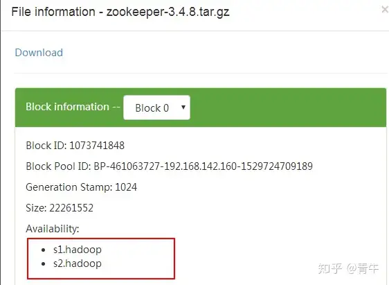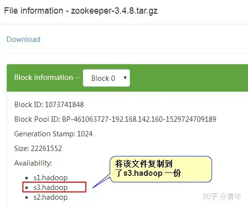 ⑤ 查看 /zookeeper-3.4.8.tar.gz 文件块位置