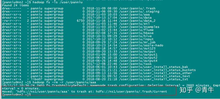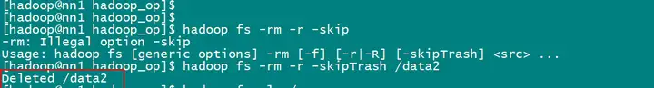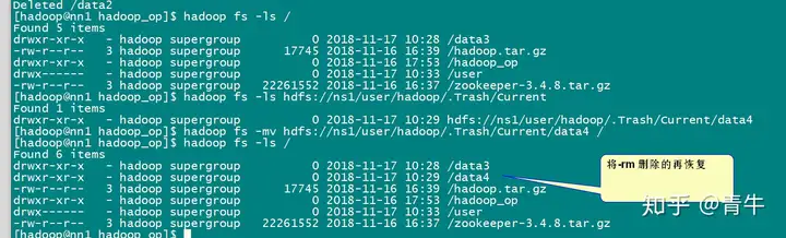 执行-rm 命令后,默认是把文件移动到 /user/hadoop/.Trash/Current 下,会根据配置文件配置的清理周期定期清理。