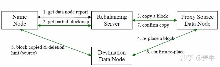 Proxy Source Data Node向Rebalancing Server确认本次数据块迁移完成。然后继续执行这个过程,直至集群达到数据均衡标准