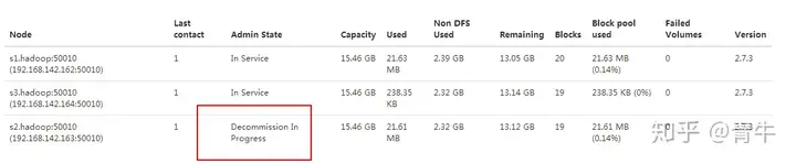 ③ 将三个datanode机器的s2.hadoop 退役,webUI显示s2.hadoop 正在退役,在退役时,会复制该节点数据到其他节点