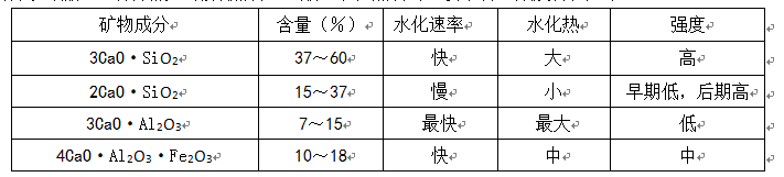 2、硅酸盐水泥熟料:将石灰石、粘土、铁粉按适当比例充分混合、磨细,制备成生料,然后将生料进行高温煅烧至部分熔融,形成熟料。硅酸盐水泥熟料的主要矿物组成及特性如下: