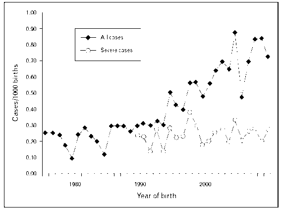 The increasing incidence of congenital hypothyroidism in New England is due to a rise in mild cases, with no change in the rate of severe congenital hypothyroidism