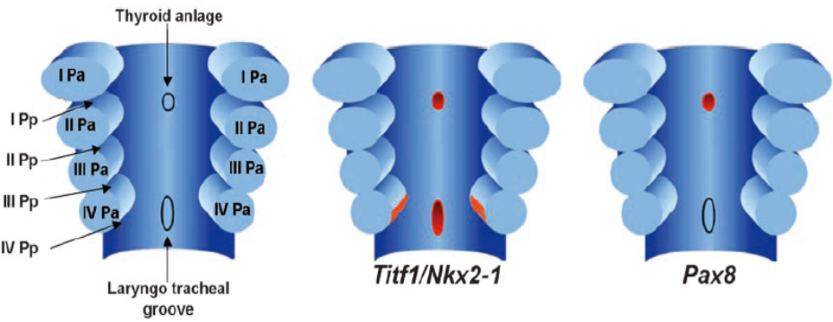 √ Titf1/Nkx2-1:甲状腺前体细胞生存必须,对甲状腺始基形成非必须
