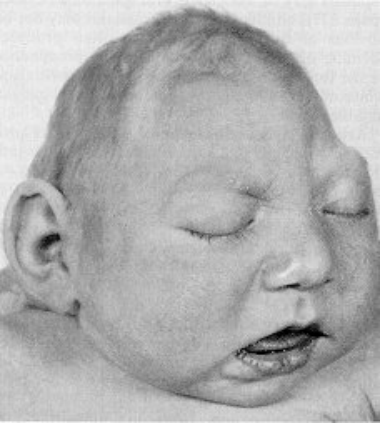 - 小头,突出面颊和上颌,齿稀疏、釉质发育不全,生长落后