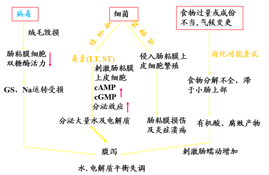 - 小肠黏膜回吸收水分和电解质能力受损,肠液在肠腔积聚