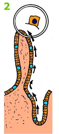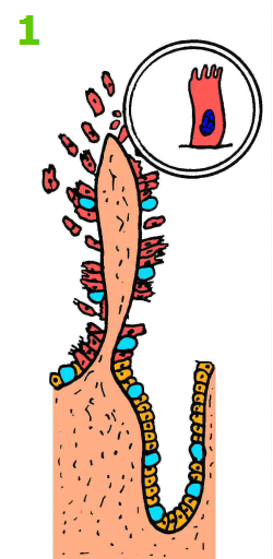 - 绒毛被无吸收功能的不成熟分泌细胞覆盖:无刷状缘,无涮状缘酶
