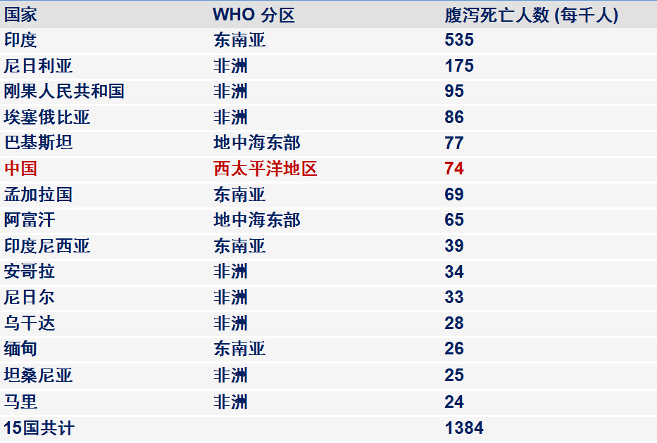 5岁以下因腹泻死亡的前15个国家均为发展中国家