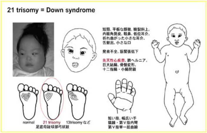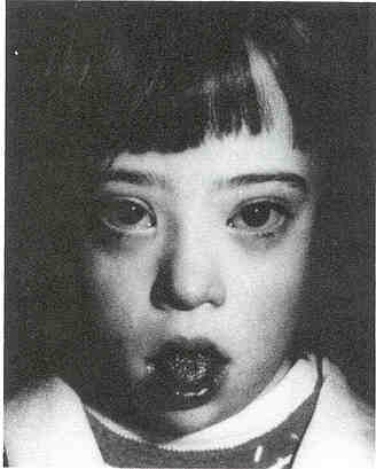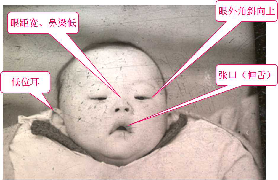 (flattened face and occiput, large tongue, small ears, epicanthal folds)