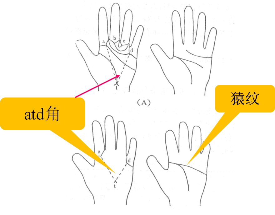 Down综合征儿童t点移向掌心atd角增大,>58°