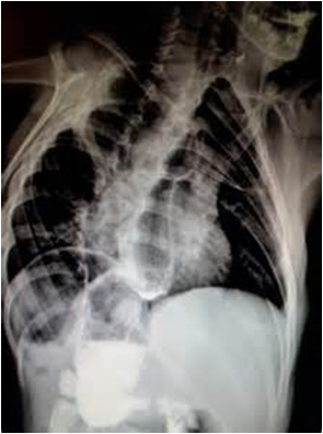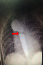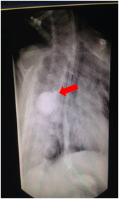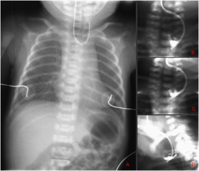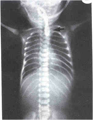 2.颈、胸、腹正侧位X线摄片示导管卷曲或造影显示食道近端盲袋。