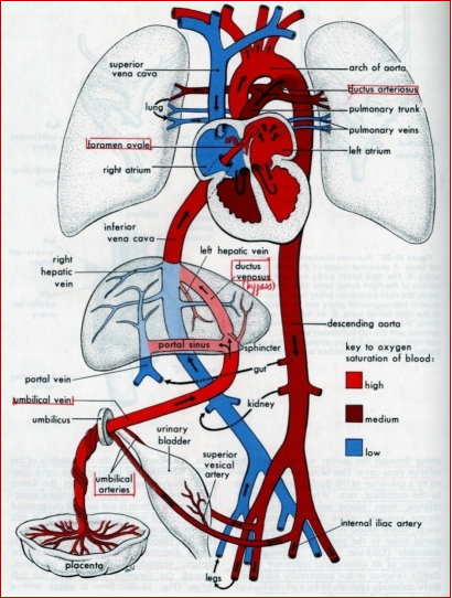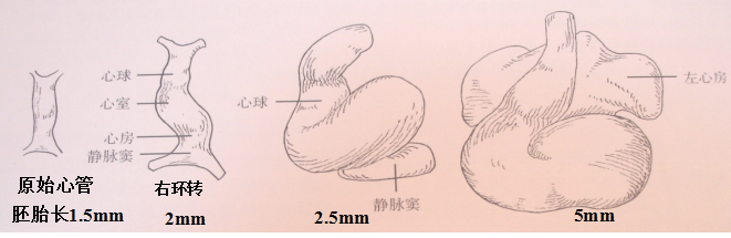 原始心脏:原始心房、心室和心球、动脉总干和静脉窦