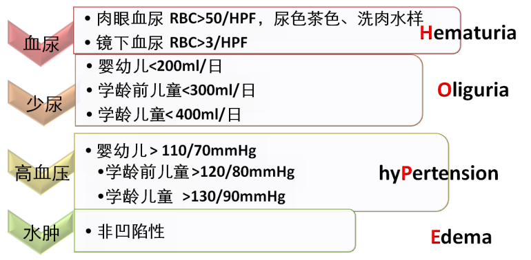 典型病例有链球菌前驱感染史,以血尿为突出表现,可伴水肿、少尿、高血压