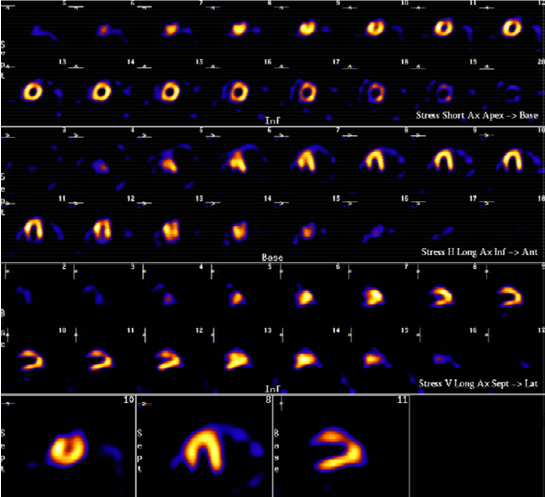 99Tcm-MIBI心肌灌注显像显示左室前壁和心尖局灶性缺血