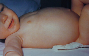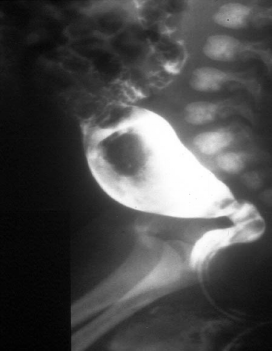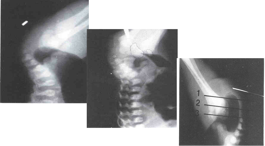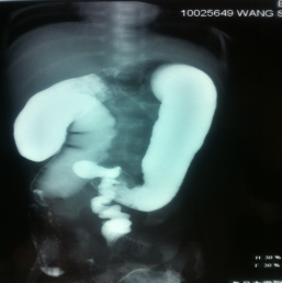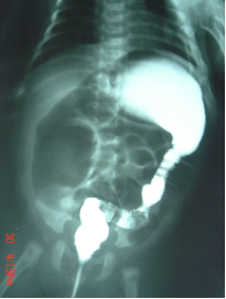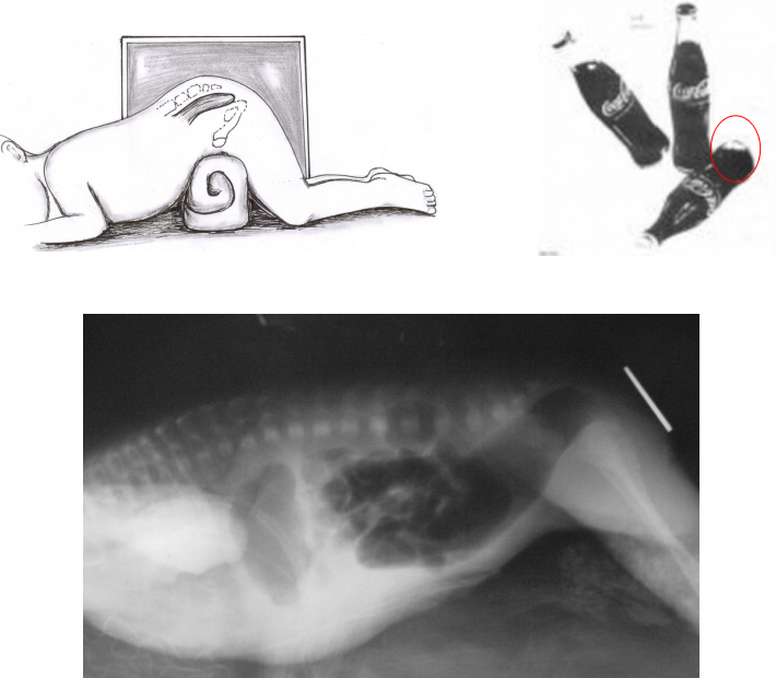 X线征象:出生12h后进行倒立侧位摄片(时间、体位、按摩、肛门标志)
