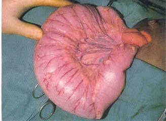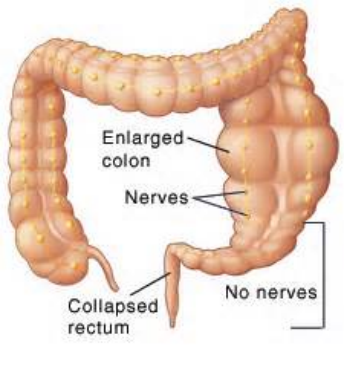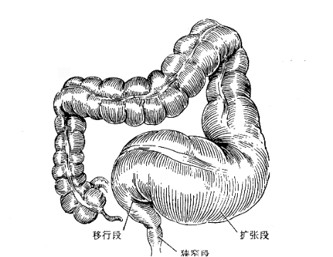 ▷ 扩张段:近端结肠扩大、肥厚、苍白、粘膜水肿、粪块