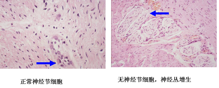 ▷ 孕6 ~ 12周,来源于神经嵴的成神经细胞沿肠管由头向尾迁移受阻,致远端神经节细胞缺如