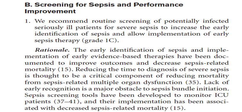 ◇ 推荐:严重感染患者筛查是否严重脓毒症,以便早期识别、早期治疗,改善预后、降低脓毒症相关病死率。具体实施:应用脓毒症筛查工具