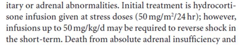 ◇ 对液体复苏无效、儿茶酚胺抵抗休克、怀疑或证实绝对肾上腺素不全(25%),及时应用氢化考的松