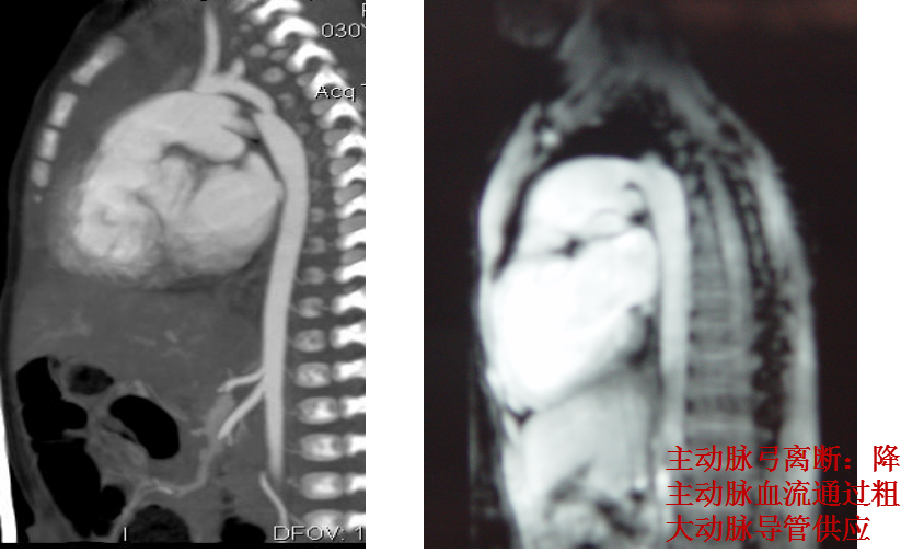 主动脉弓缩窄伴弓部及降部发育不良 主动脉弓离断:升主动脉与降主动脉不连续,