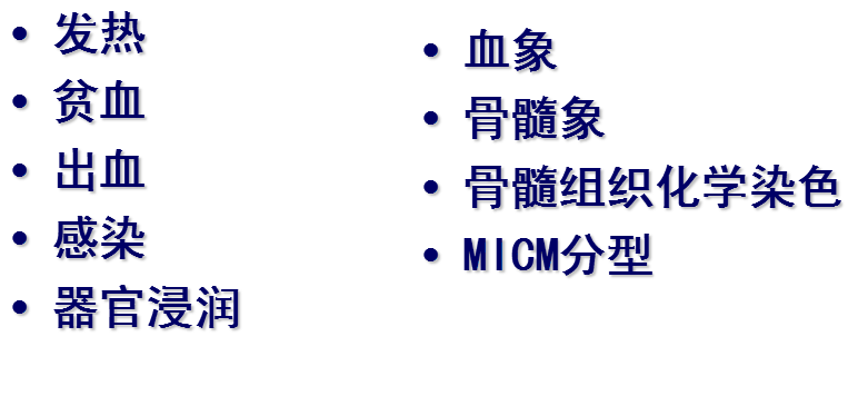 发热、贫血、出血、感染、组织侵犯