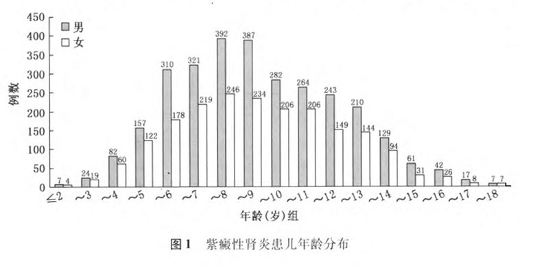 全国4863例HSPN患儿,男:女=1.52:1,高发年龄6-13岁与国外报道一致
