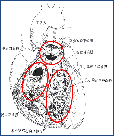 ◇ 室间隔缺损是由于各部位室间隔交界处的间隔发育不全、融合不好,或某一间隔发育缺如而形成