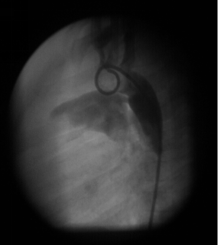 △ 主动脉弓降部造影主动脉侧位显示PDA