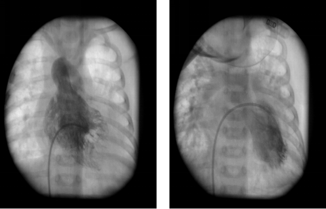 大动脉换位:肺动脉瓣下圆锥萎缩,肺动脉位于左