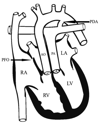 右室后负荷增加而扩大肥厚,左室后负荷降低,室间隔偏向左室体肺循环之间仅靠卵圆孔未闭和动脉导管未闭沟通,青紫缺氧严重