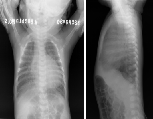 充血性心力衰竭:喂养困难、多汗、气促、肝脏增大、肺部细湿罗音