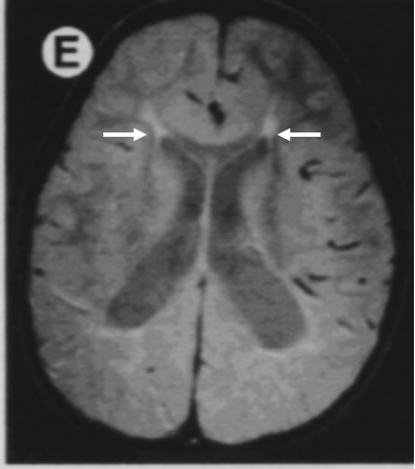 4、MRI:对病变性质和程度评价优于CT,对矢状旁区和基底节损伤的诊断尤为敏感。多层面成像,分辨率高,无放射性损害,但所需时间长、噪音大、费用高