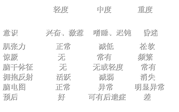 3、出生后不久出现神经系统症状,并持续到24小时以上,如意识改变(过度兴奋、嗜睡、昏迷)、肌张力改变(增高或减弱),原始反射异常(吸吮、拥抱反射减弱或消失),病重时可有惊厥,脑干体征(呼吸节律改变、瞳孔改变、对光反应迟钝或消失)和前囟张力增高。