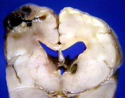 继发于IVH的PVL主要因出血血液进入脑脊液引起持续存在明显的脑血流减少而引起,这些患儿部分发生孔洞脑及脑穿通畸形